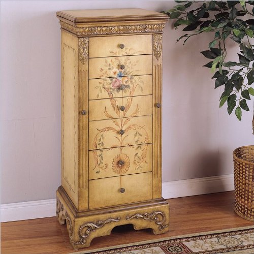 - Masterpiece Antiqued Parchment jewelry armoire with stylized floral design